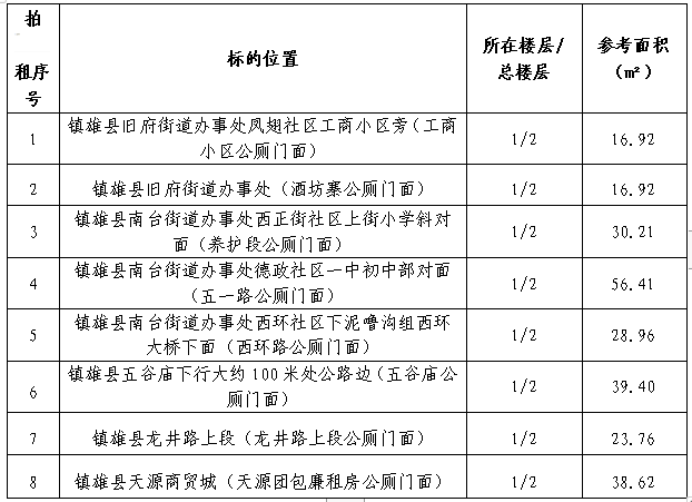 受鎮(zhèn)雄縣物業(yè)管理中心委托:公開拍租鎮(zhèn)雄縣主城區(qū)內(nèi)8個(gè)公廁門面3年期經(jīng)營(yíng)權(quán)。相關(guān)事項(xiàng)如下: